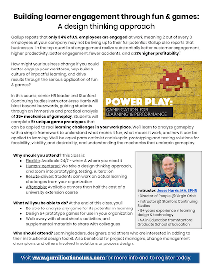 If you've missed one of our popular gamification classes at Stanford, here's your chance to learn about gamification for training & learning. In this new course, you'll learn how to analyze popular games for the elements that make them work, make them fun, and make them perfect for your learning challenges.